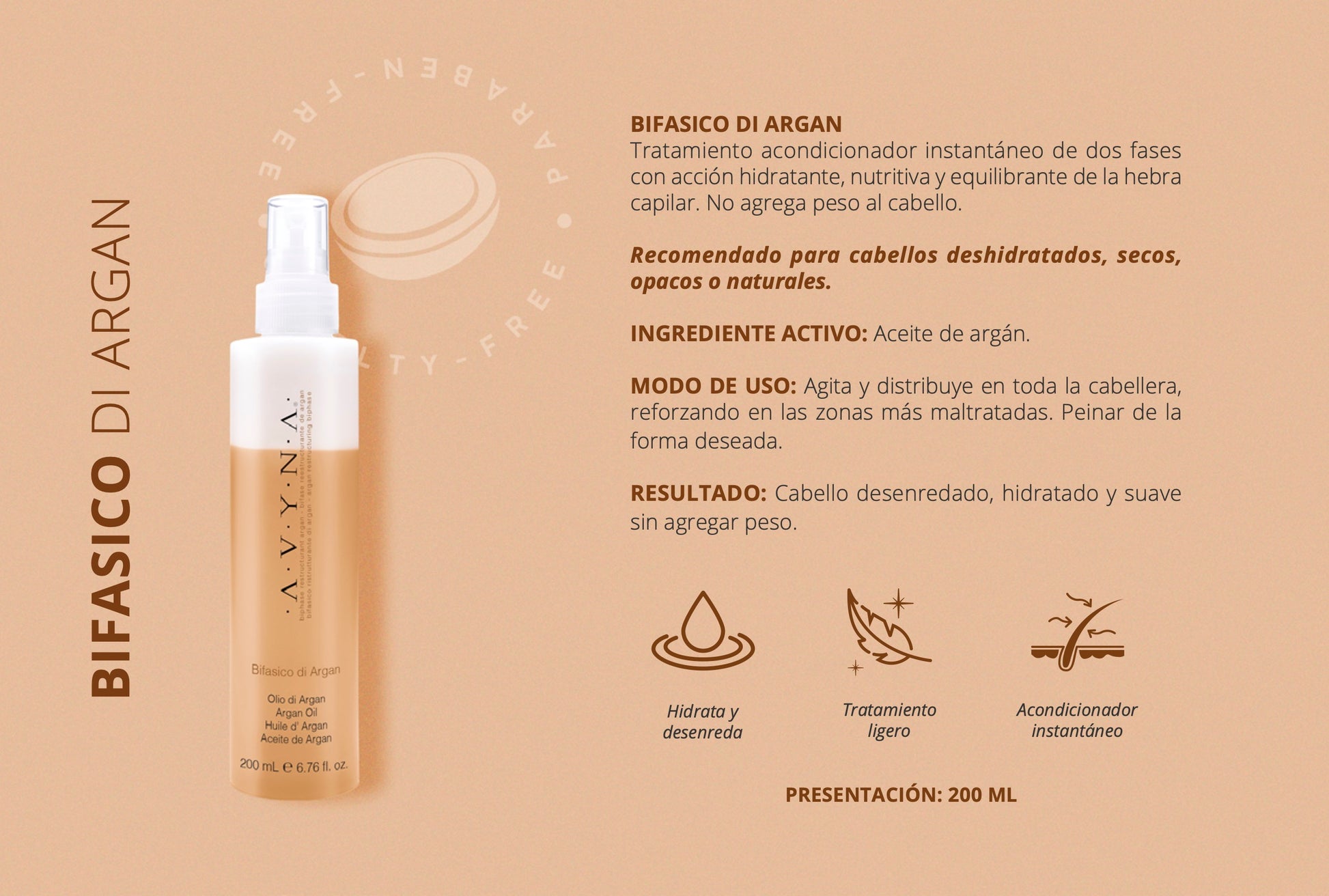 Acondicionador instantáneo en spray con acción hidratante, nutritiva y equilibrante de la hebra capilar. Enriquece el pelo con los beneficios del argán sin agregar peso. Sin aclarado.