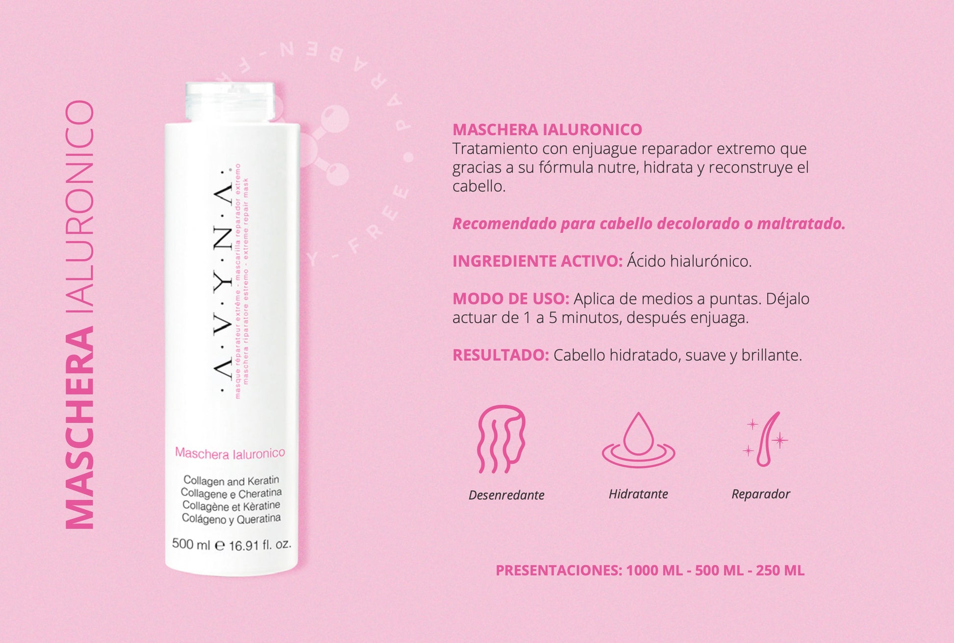 Tratamiento reparador extremo que gracias a su formula enriquecida con Colageno, Acido Hialuronico y Queratina nutre, hidrata y reconstruye el pelo, dejandolo sedoso y brillante.