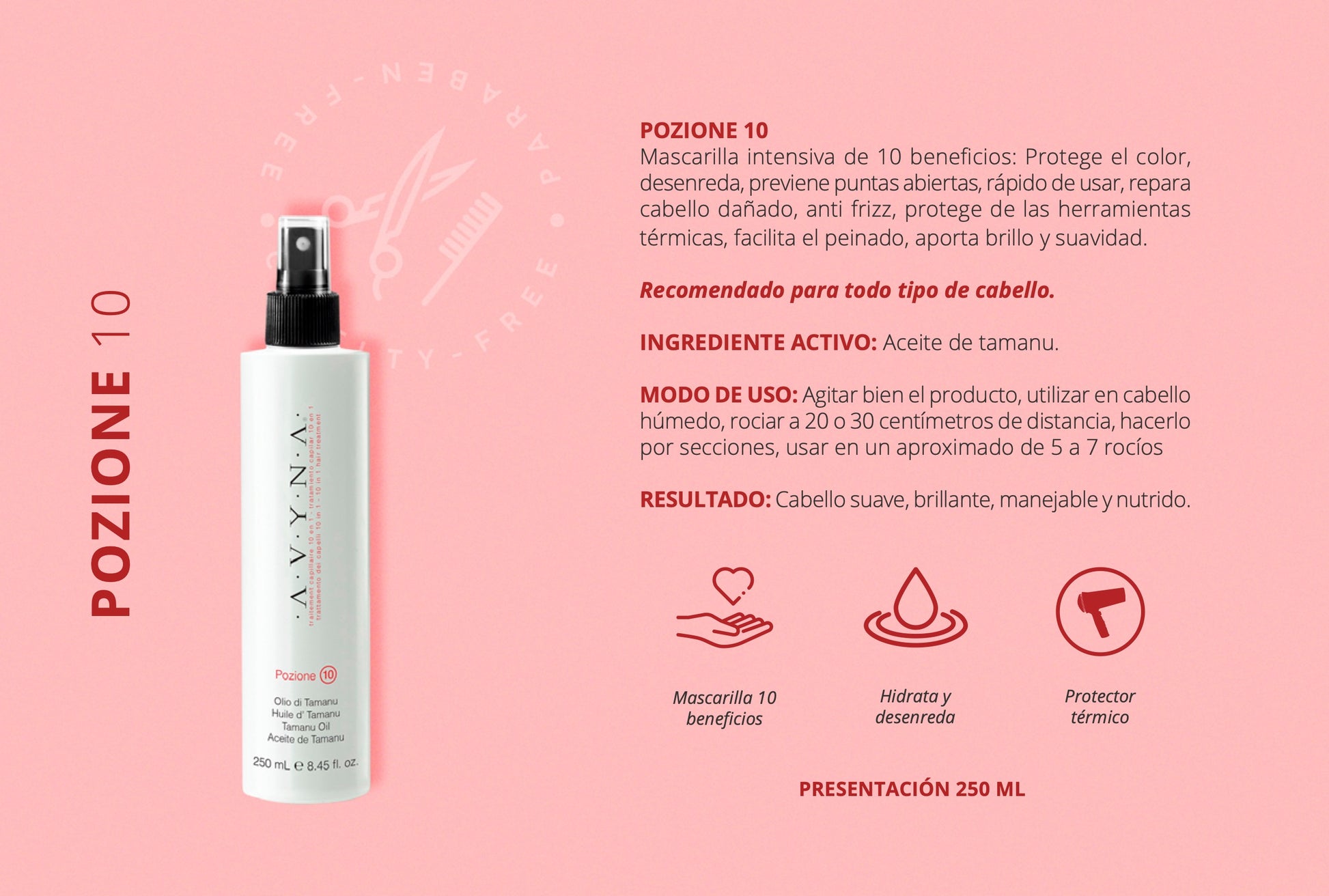 Mascarilla intensiva de 10 beneficios. Adecuado para todo tipo de cabello: fino, seco, rizado o maltratado.
