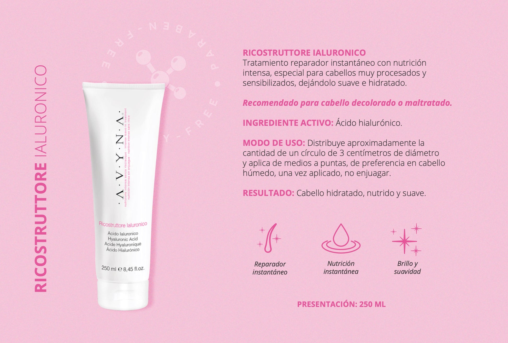 Es un tratamiento reparador instantaneo con nutricion intensa especial para pelo muy procesado y estropeado. Su innovadora formula basada en Ácido Hialurónico, nutre, hidrata y repara el pelo mas dañado, dejándolo suave y con brillo. Sin aclarado.